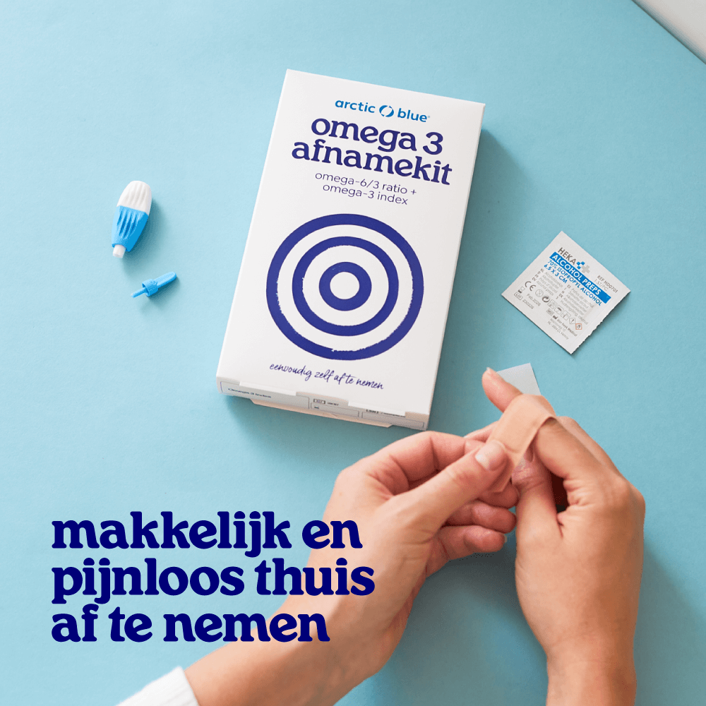 Je krijgt een platte test kit in je brievenbus. Deze bevat alles wat je nodig hebt om via een vingerprikje 2 druppels bloed op een speciaal kaartje te laten vallen. Volg je de instructies? Dan kan het bijna niet fout gaan en is het pijnloos. Vervolgens stop je het kaartje in de bijgeleverde retourenvelop (met antwoordnummer) en stuur je deze naar ons op. Samen met ons gecertificeerde lab in Duitsland zorgen we dat je ongeveer na 15 werkdagen het resultatenrapport via e-mail ontvangt. Je weet dan precies hoeveel omega-3 vetzuren jouw lichaamscellen bevatten en hoe deze zich verhouden ten opzichte van de omega-6 vetzuren.