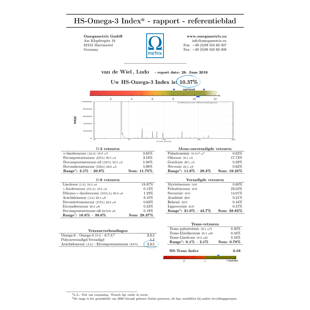 Hier een voorbeeld van het resultatenrapport. Op de laatste overzichtspagina staat bovenaan de HS-Omega-3 Index. Linksonder staat de vetzuurverhouding.