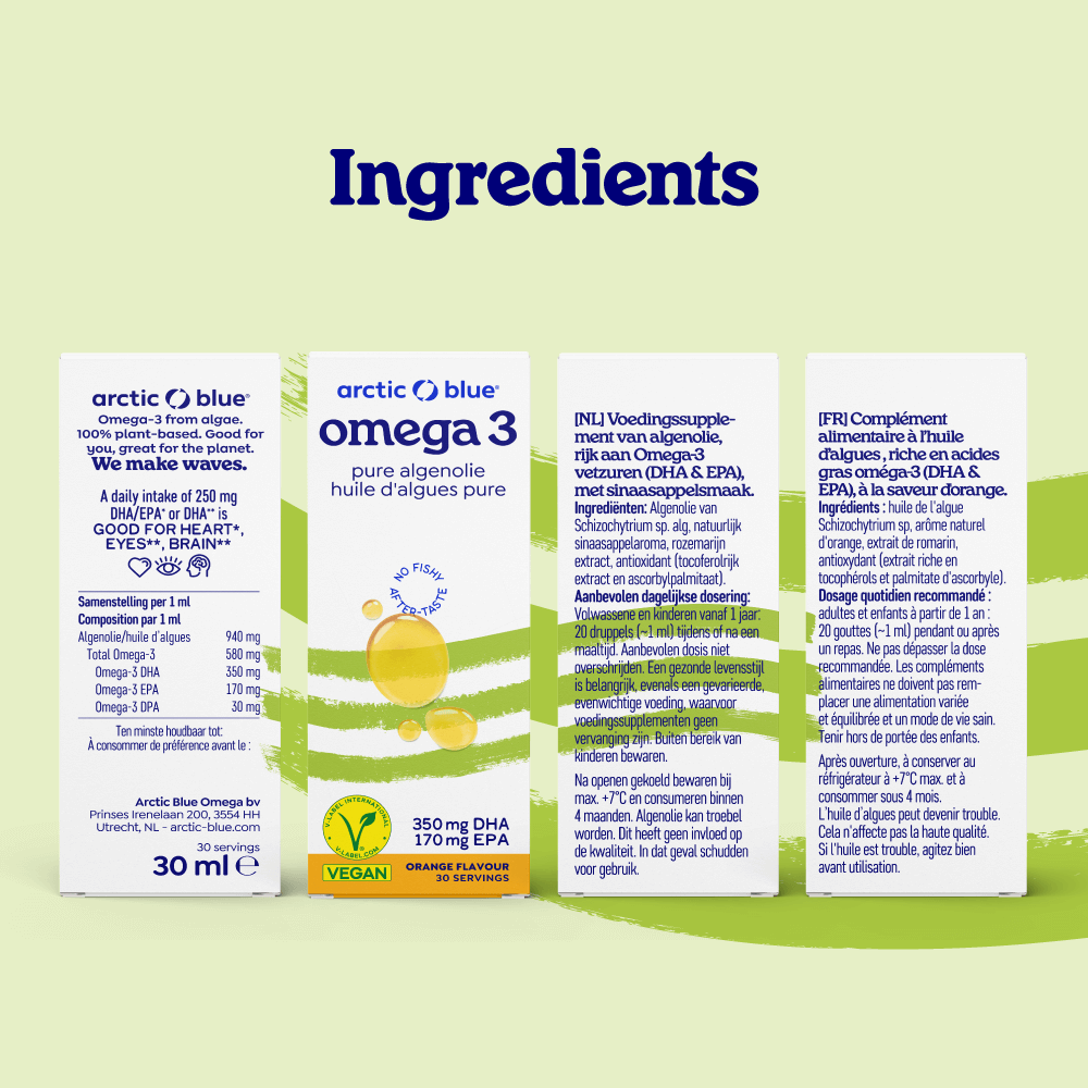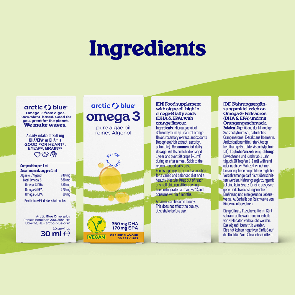 Oil of the microalgae Schizochytrium sp., natural orange aroma, rosemary extract, antioxidant (tocopherol-rich extract and ascorbyl palmitate).