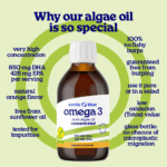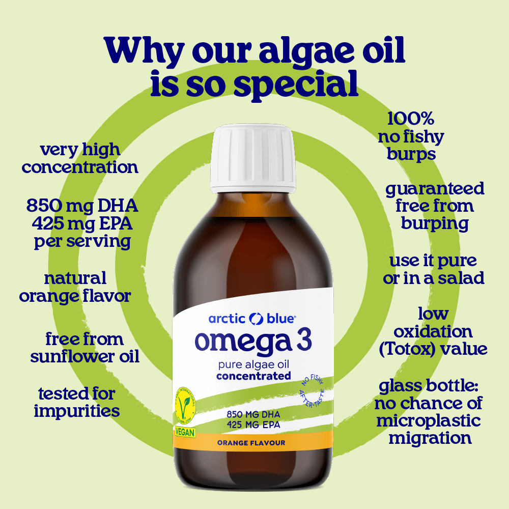 Oil made from algae, is the only oil on earth that contains the same Omega-3 fatty acids EPA and DHA as fish oil. This is not surprising considering that oily fish depend on eating algae or eating small fish that have eaten algae. The flavor of the oil lends itself to use in yogurt, for example, as well as right off the spoon. No chance of fish taste or belching.