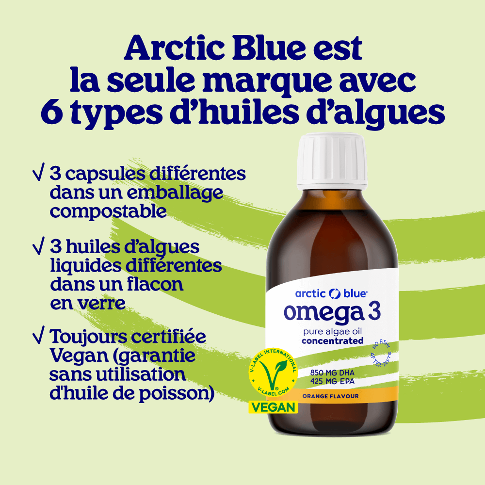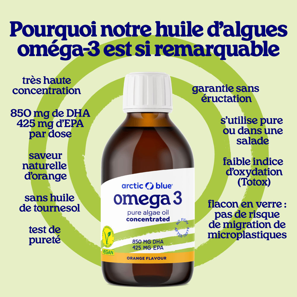 L'huile fabriquée à partir d'algues est la seule huile sur terre qui contient les mêmes acides gras oméga-3 EPA et DHA que l'huile de poisson. Ce n'est pas surprenant si l'on considère que les poissons gras dépendent de la consommation d'algues ou de petits poissons qui ont mangé des algues. La saveur de l'huile se prête à une utilisation dans les yaourts par exemple, mais aussi directement à la cuillère. Aucun risque de goût de poisson ou d'éructation.