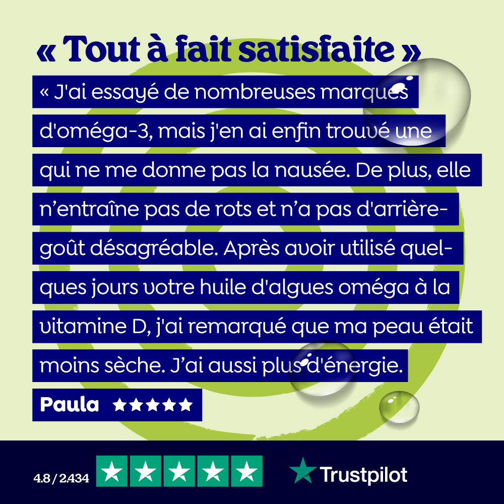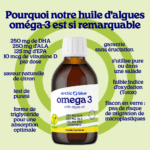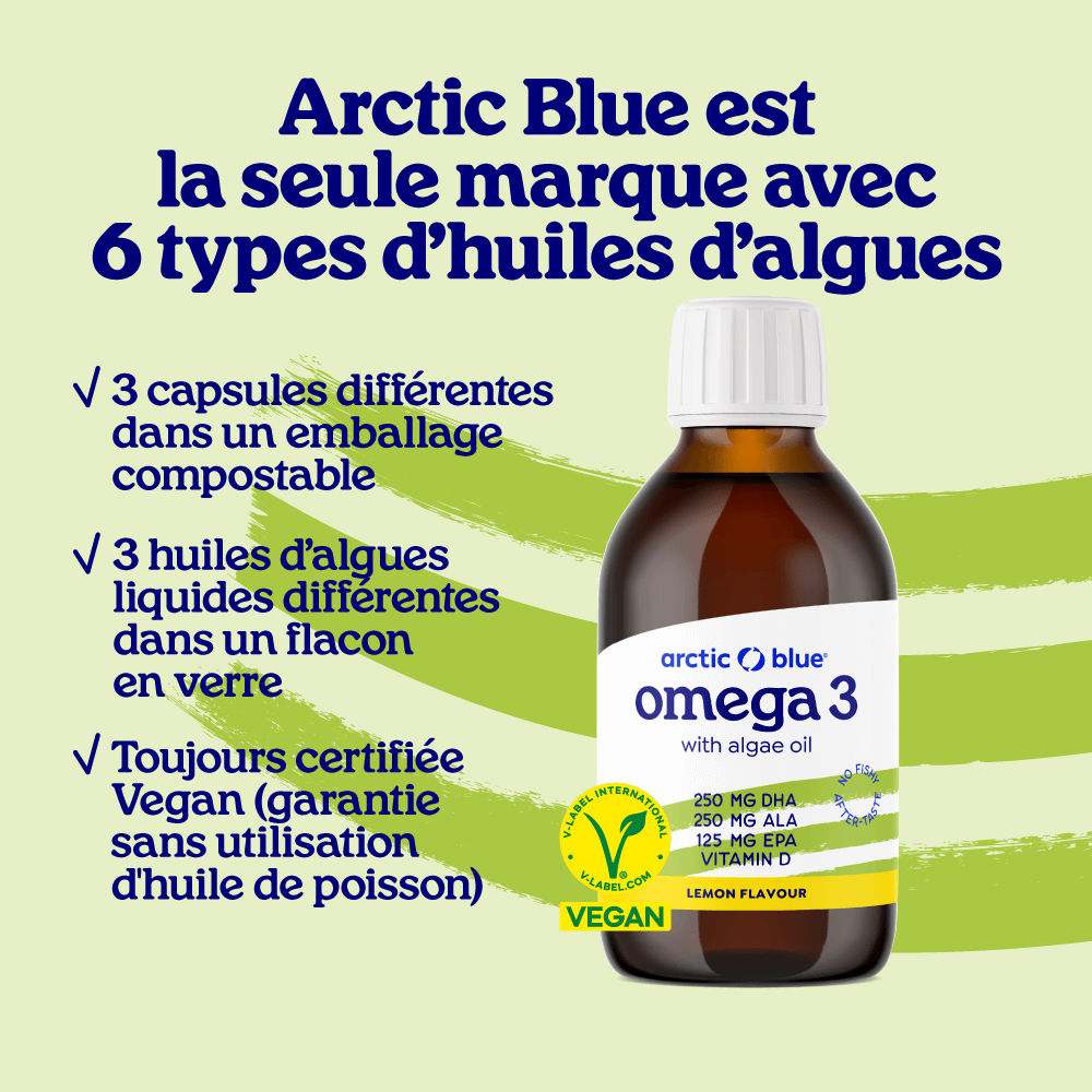 L'huile fabriquée à partir d'algues est la seule huile sur terre qui contient les mêmes acides gras oméga-3 EPA et DHA que l'huile de poisson. Ce n'est pas surprenant quand on sait que les poissons gras dépendent de la consommation d'algues ou de petits poissons qui ont mangé des algues. La saveur de l'huile se prête à une utilisation dans les yaourts par exemple, mais aussi à prendre directement à la cuillère. Aucun risque de goût de poisson ou d'éructation.