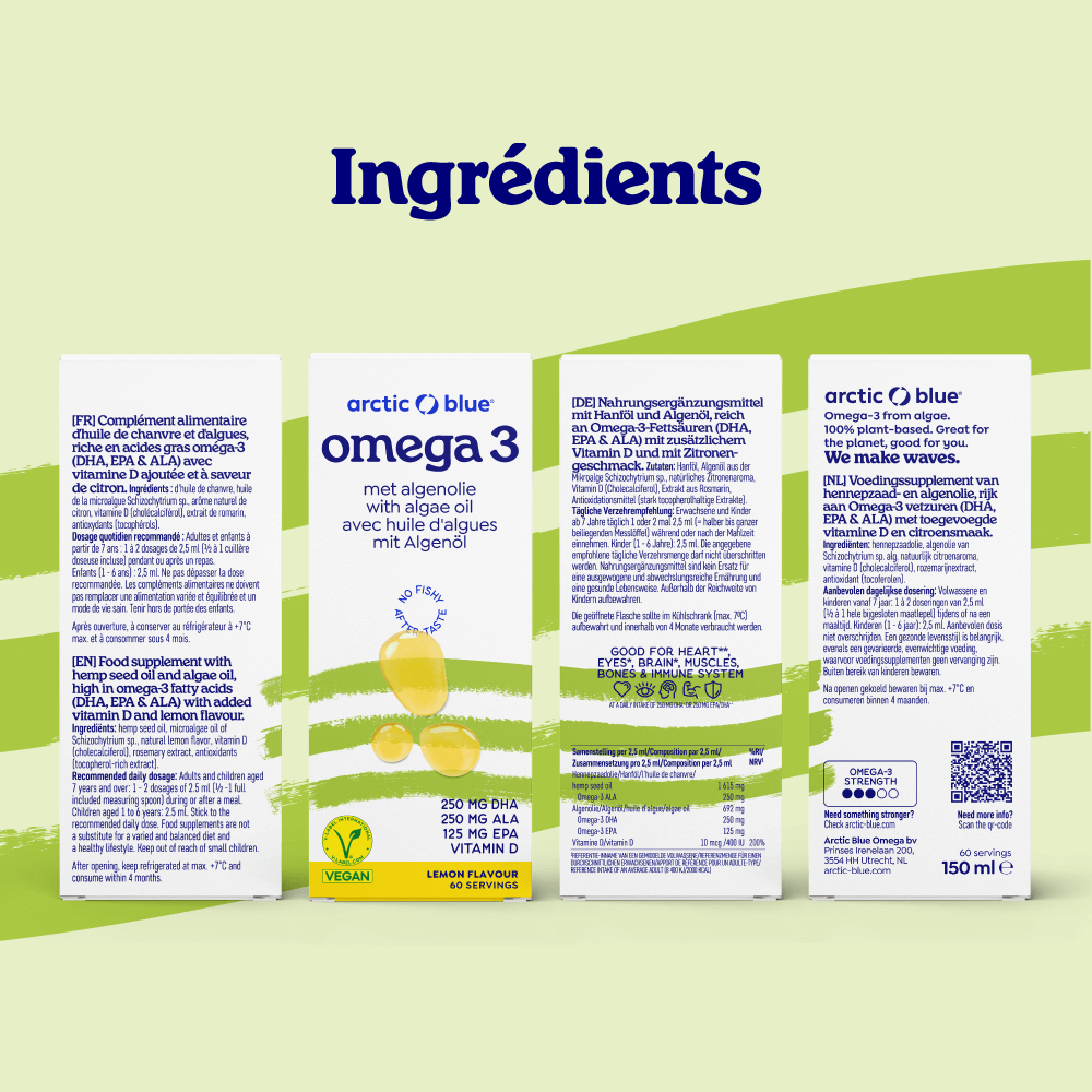 Huile de graines de chanvre, huile d'algues Schizochytrium sp., arôme naturel de citron, huile de tournesol riche en acide oléique, vitamine D (cholécalciférol), extrait de romarin, antioxydant (tocophérols). Les tocophérols, antioxydants naturels contenant de la vitamine E, protègent les acides gras oméga-3 sensibles. L'arôme de citron provient donc de vrais citrons. L'extrait de romarin provient de vraies feuilles de romarin.