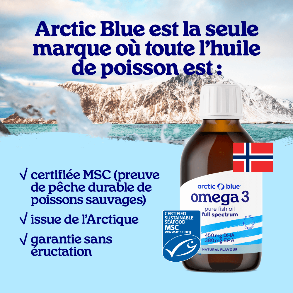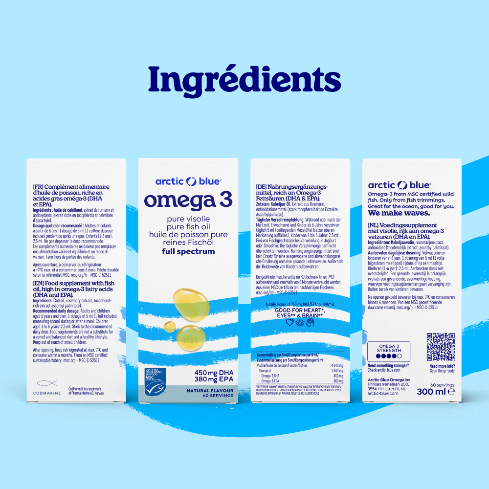 Les poissons gras sauvages comme le hareng, la sardine ou le maquereau sont une très bonne source de précieux acides gras insaturés oméga-3 EPA et DHA. En revanche, les poissons maigres (croquettes, bâtonnets de poisson, tilapia et pangasius) ne contiennent pratiquement pas ces nutriments importants. L'huile de poisson Pure Arctic MSC est là pour tous ceux qui ont du mal avec les poissons gras. La dose quotidienne (5 ml) (un dessert ou une cuillère à café) de Pure Arctic Fish Oil contient les acides gras oméga-3 de plus d'un demi-hareng (converti). Il est scientifiquement prouvé que cette quantité d'EPA et de DHA est bonne pour le cœur**, bonne pour la vue* (aide à rester vif) et bonne pour les fonctions cérébrales*. L'effet bénéfique est obtenu avec une consommation quotidienne de 250 mg de DHA* ou de 250 mg d'EPA/DHA**. Il s'agit d'allégations de santé approuvées par la loi. Jusqu'à 20 % de la graisse de notre cerveau est constituée d'oméga-3 DHA ; c'est un élément constitutif important du cerveau (comme le calcium l'est pour les os). Il a également été scientifiquement prouvé que l'EPA et le DHA ont un effet bénéfique sur la tension artérielle* et le taux de triglycérides** (graisse dans le sang). L'effet bénéfique est obtenu avec un apport quotidien de 3000* mg et 2000** mg d'EPA/DHA.