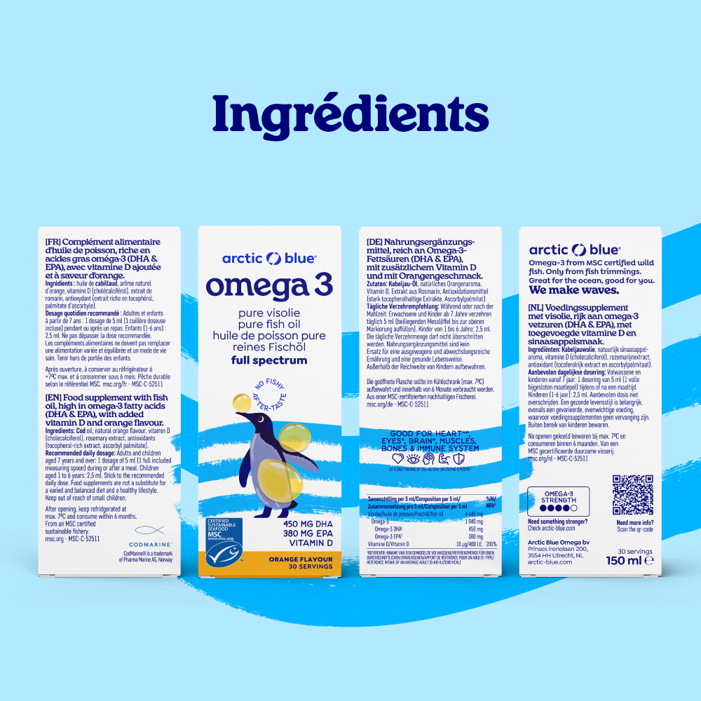 Les poissons gras sauvages, comme le hareng, la sardine ou le maquereau, sont une très bonne source de précieux acides gras insaturés oméga-3 EPA et DHA ainsi que de vitamine D. Beaucoup de poissons préparés pour les enfants (kibbeling, bâtonnets de poisson, tilapia et pangasius) sont des poissons maigres qui contiennent à peine ces nutriments importants. Brain Building Blocks Kids contient de l'huile de poisson pure Arctic MSC avec de la vitamine D et convient à tous ceux qui ont des difficultés avec les poissons gras. Un dessert/une cuillère à café de Pure Arctic Fish Oil contient les acides gras oméga-3 de plus d'un demi-hareng (converti). Il est scientifiquement prouvé que cette quantité d'EPA et de DHA est bonne pour le cœur**, bonne pour la vue* (aide à rester vif) et bonne pour les fonctions cérébrales*. L'effet bénéfique est obtenu avec une consommation quotidienne de 250 mg de DHA* ou de 250 mg d'EPA/DHA**. Il s'agit d'allégations de santé approuvées par la loi. Jusqu'à 20 % de la graisse de notre cerveau est constituée d'oméga-3 DHA ; c'est un élément important pour le cerveau (comme le calcium pour les os). La vitamine D contenue dans l'huile de poisson est importante pour que tes enfants aient des os et des dents solides. La vitamine D contribue à une bonne immunité et joue un rôle dans le maintien de muscles forts. Des recherches ont montré que de nombreux enfants de couleur souffrent d'une carence en vitamine D. Il est recommandé, surtout pendant les mois d'hiver et au printemps, de donner à ton enfant un supplément de vitamine D (par exemple dans l'huile de poisson). De plus en plus d'enfants à la peau blanche souffrent également d'une carence en vitamine D. D'une part, les gens mangent moins de poisson et d'autre part, ils jouent davantage à l'intérieur, ce qui fait que leur peau reçoit moins de lumière du soleil.