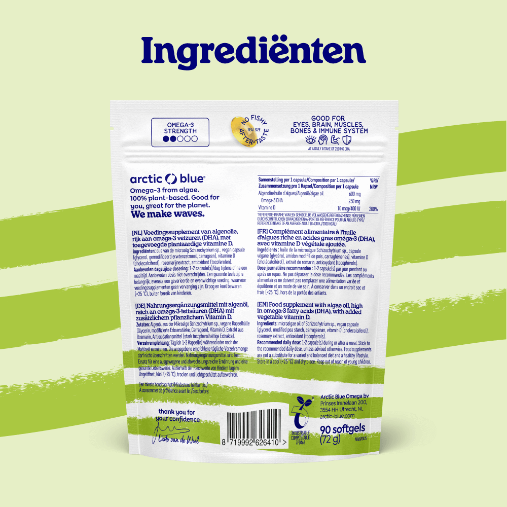 Schizochytrium sp. Algenolie, glycerol, gemodificeerd zetmeel, carrageen, hoog oliezuur zonnebloemolie, plantaardige vitamine D3 (cholecalciferol), natuurlijk rozemarijn extract, antioxidant (natuurlijke tocoferolen, ascorbylpalmitaat), zuurteregelaar (dinatriumfosfaat). Plantaardige algenolie wordt gemaakt van gekweekte microalgen in een gesloten systeem zonder milieu invloeden van buitenaf. Zo’n fermentatieproces lijkt op hoe yoghurt (m.b.v. bacteriën) en bier (m.b.v. gisten) in een fermentor wordt gemaakt De olie wordt uit de algenmassa geperst en er wordt natuurlijk antioxidant toegevoegd om de gevoelige Omega-3 vetzuren te beschermen. Een kleine beetje zonnebloemolie dient om de hoeveelheid Omega-3 DHA constant te houden. De plantaardige vitamine D3 wordt aan de algenolie toegevoegd voordat de capsules worden gemaakt met behulp van zeewier extract (carrageen). Het vitamine E houdende natuurlijke antioxidant beschermt de gevoelige Omega-3 vetzuren. Plantaardige tocoferolen (o.a. alfatocoferol) is vitamine E en beschermt als antioxidant de gevoelige Omega-3 vetzuren. <1 mg per capsule. Ascorbylpalmitaat is de vetoplosbare vorm van vitamine C en beschermt (net als rozemarijn extract) als antioxidant ook de gevoelige Omega-3 vetzuren. < 1 mg per capsule. Schizochytrium sp. is de naam van de algensoort. We zijn wettelijk verplicht deze te vermelden. Glycerol is een verdikkingsmiddel die samen met zetmeel (zie veelgestelde vragen) en carrageen het capsuleomhulsel vormt. Tezamen 25% van de hele capsule. Dinatriumfosfaat is in voeding een standaard zuurteregelaar die in minuscule hoeveelheid (<3 mg) mede zorgt voor stevigheid van de capsule. De capsule is vrij van kunstmatige aroma’s en vrij van conserveringsmiddelen, kleur- of zoetstoffen.
