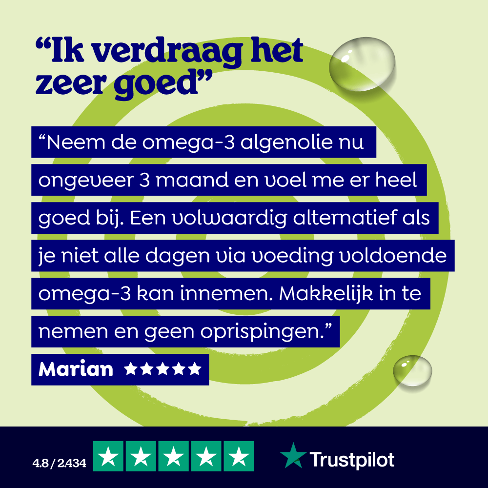 Algenolie capsules niet op de nuchtere maag innemen, maar vlak voor of vlak na een maaltijd.