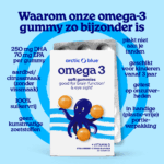 Met DHA & EPA Omega-3 vetten +Vitamine D3, goed voor de hersenfunctie, ogen, hart, botten, spierfunctie en immuunsysteem. Gummies zijn populair vanwege de smaak, maar hebben helaas ook nadelen. Ze bevatten vaak suiker en veel calorieën, plakken aan je tanden en aan de binnenkant van de pot. Daarnaast bevatten de Omega-3 varianten vaak bizar weinig Omega-3… erg jammer allemaal.