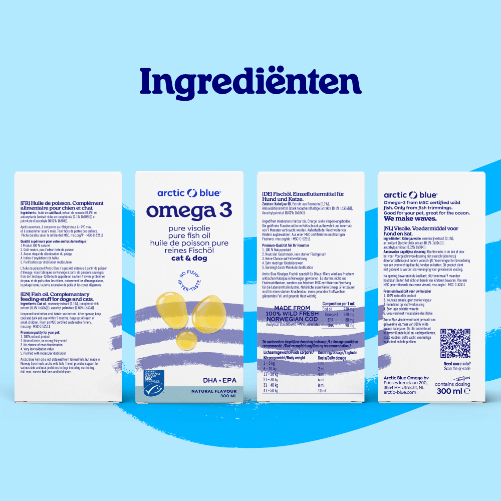 Omega-3 essentiële vetzuren in de vorm van vloeibare visolie voor hond, kat (en paard) voor oraal gebruik. Aanvullend diervoeder ter bevordering van een evenwichtig dieet bij honden en katten. Dit product dient niet gebruikt te worden als vervanging voor gevarieerde voeding. Omega-3 olie is voor honden en katten van alle leeftijden en rassen geschikt. Rechtstreeks in de bek (na het eten) of door het voer. Hoeveel visolie per dag mag een hond of kat? De aanbevolen dagelijkse dosering bedraagt: