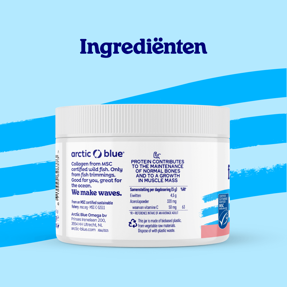 Dat betekent dat het de bouwstenen bevat voor ons eigen menselijk collageen. Bovendien bevat Puur Arctisch Collageen poeder ook natuurlijke vitamine C, dat van belang is voor de vorming van lichaamseigen collageen wat de huid verstevigt.