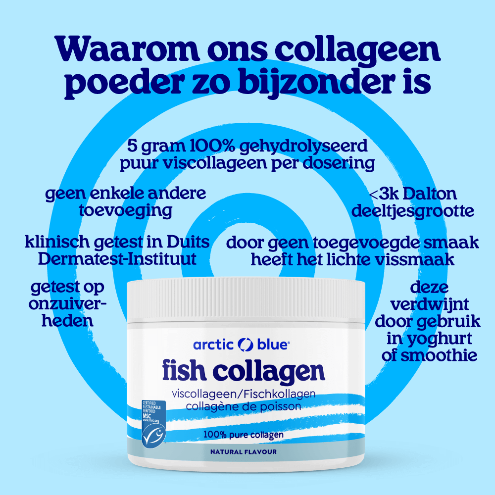 Collageen hydrolysaat betekent dat het viscollageen in kleinere stukjes eiwit is geknipt (gehydrolyseerd), de zogenaamde peptiden. Elk collageen supplement (poeder of capsules) is een hydrolysaat. In ons lichaam knippen we de peptiden verder in losse aminozuren die in het bloed worden opgenomen. De reden waarom Arctic Blue voor viscollageen kiest, is dat deze het meest vergelijkbaar is met menselijk collageen, wat hier wordt uitgelegd. Daarnaast is Arctic Blue het enige merk met een keurmerk voor het collageen poeder, dat bewijst dat het afkomstig is van wilde vis (en niet van bijv. kweek-tilapia of koeien).